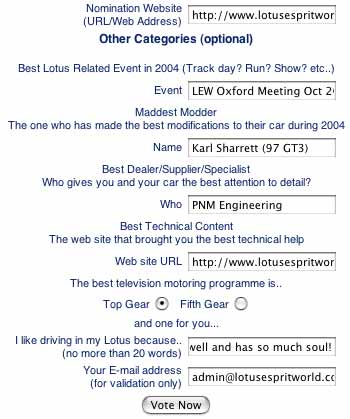 This is your chance to nominate any Lotus related web site you think deserves the award for supporting Lotus owners throughout 2004, whether it's the factory web site, your local club or events and run web site. You could vote for Lotus Esprit World ;-) To have your vote, go to:www.southrun.co.uk/woty2004.php