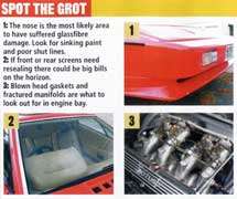 More serious is poorly repaired accident damage, especially where glassfibre hasn't been let in properly. The most likely areas for such wounds are the car's corners, although parking scrapes could lead to scars anywhere. Look for paint that has sunk. It will appear mottled where some of the pigment has remained on the surface while the rest has sunk into the plastic. It's possible to invisibly mend damaged glassfibre, but it's a skilled job that isn't attempted lightly. If scars are evident get an estimate of what a specialist will charge to put it right, if it's not something you can fix yourself. If there are several areas that need to be treated, it's going to be a labour intensive (and costly) process grinding back the glassfibre and letting in fresh matting.