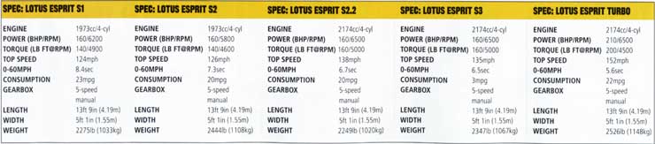 1981: The normally aspirated Esprit becomes the S3 with the same chassis and suspension at the Turbo; 767 made. The turbo becomes a regular production mode with a reduced trim specification; 1608 made.