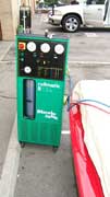A connection was made to the filler and the vacuum pump switched on to remove any remaining oil / refrigerant in the system. At the same time a vacuum is built up within the system which checks for any leaks and later allows the new oil /refrigerant to be drawn in.