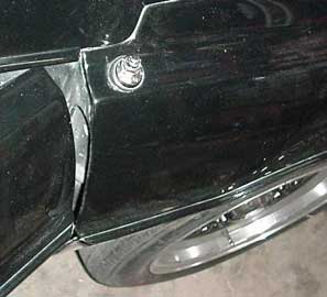 Inside the passenger footwell area at the base of the front wheel arch, peel away the carpeting just enough to expose the bottom and the right side of the wheel arch cover.