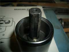 Imagine a cross-shaped hole at the end of a shaft with four teeth at each point of the cross that clamp into each notch of the thread on the piston shaft using a ratchet system. There is a gap between each of these four teeth. When the mechanism is set to work, the piston can move forwards but not backwards. The piston must be rotated to align the gaps with the splines thus allowing it to freely move back and forth.You will need another bit of that nice square metal stuff, or a suitable tool to fit between the 2 notches on the end of the piston allowing you to turn it. If you rotate it slowly (clockwise or anticlockwise) you will hear, hopefully (after you’ve turned down the radio), a small click which lets you know that all is aligned and the piston can be pushed back using a C-clamp. On mine the rotation was about 30º to clicking point.