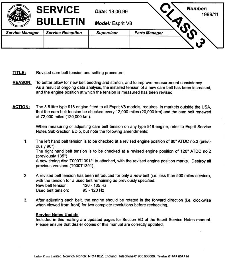 The Lotus 918 is an interference design engine, meaning that it is possible for the valves to contact the pistons if correct cam timing cannot be maintained. With this in mind, great care must be taken when setting cam timing and adjusting tension belt tension.