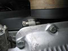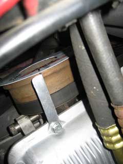 Once the tolerance pins have confirmed that the cam/crank position and timing is correct, you must remove the pins :rolleyes: We were deep in instruction mode and forgot to take a picture..... here is one from the Library. From underneath, attach a timing pointer to a convenient sump bolt and fix your timing disc to the front of the TV damper.