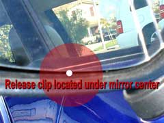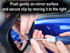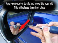 Step 1: Get a small slotted ( flat) screwdriver and carefully place the flat blade against the small vertical tab located approx mid section behind the bottom of the mirror glass. You can just see it if you use a flashlight ( torch in the UK ). Carefully push this clip to the LEFT ( on the left side of the vehicle looking forward ). I have not tried to remove the right hand side yet so you will need to try left first then right., on the opposite side of the vehicle.