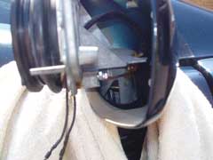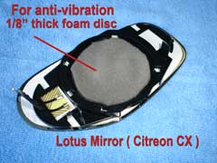 NOTE: To remove the vibration, get a piece of light foam and cut it to approx 2,5” diameter circle at 1/8” thick, and apply it to the center of the mirror glass backing, ( this is usually sticky and the foam stay where you put it nicely.)