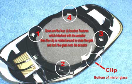 The back of the mirror has a round assembly with a locking ring to latch the glass assembly to the actuator. This movable clip rotates about 15 degrees around the circumference of this circle and locks the two parts together. Simple.