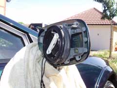 Once the shroud is removed, the mirror is located in place by a locking ring. A small lug on the underside of the mirror, when rotated, will release the mirror. No force is required, it will simply lift out. Although still attached by some leads, I just left the mirror dangling on the side of the car, with a towel underneath to protect my paintwork.
