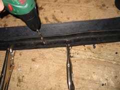 The rubber arrives over length and without any fixing holes. First thing to do is to remove the old rubber. This is fixed by 30 screws, washers and flat speaker fixings, although with most Esprits 10-15 years old, they could have been replaced by anything. You should have easy access to the fixing with the front end on axle stands. 2 of my 30 screws rounded off, so were drimelled out. This could add quite a bit of time to your installation. So I would spray all the fixings with WD40 2 days before to try and help loosen everything.