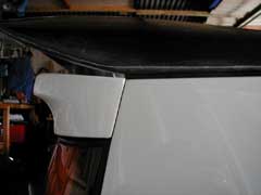 You can then offer the spoiler up to the car. Care is needed in aligning the spoiler and from the next picture you can see the position the spoiler needs to be in. There is a raised area on the base of the spoiler and this needs positioning exactly on the front edge of the gap between the rear wing and rear lip. You can also see from this picture the tape showing the position of the captive nuts. Here is the spoiler taped into position. The side-to-side fitting I did using the good old method of site of eye and feel. Some help is needed in getting the exact side position.