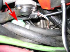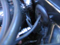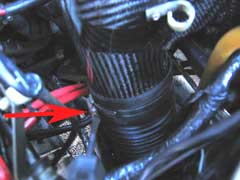 Now time to address the crankcase ventilation pipe. This pipe runs from the green filter shown in the picture above right. Follow this pipe (the one you removed from the old Airbox), we'd already trimmed ours off for the catch tank install. You may wish to reduce the size to fit.
