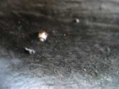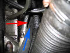 Our pipe was pushed down towards the road. You can see the pipe in the picture above left. The blue arrow follows the pipe and the red arrow points to it's end. You can also see the bleed nipple of the clutch slave cylinder. This will vent the air down out of the bottom of the car and shouldn't spray any oil mist on anything that could get too hot.