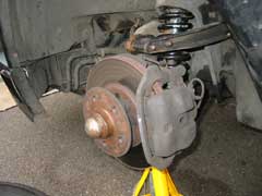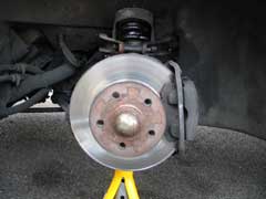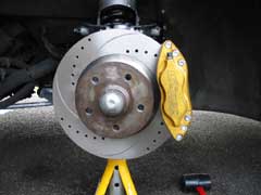 To change the brakes your going to need to jack the car up and place it on axle stands for safety. As you're going to have to bleed the brake system, you're going to need all four wheels off at some point. We did it all at once, which is quicker and easier. See the standard brakes on the right.