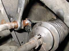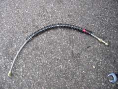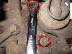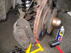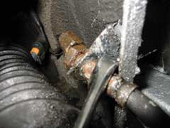 You can now remove your brake hoses. Make sure you clean up any brake fluid before you start. As I was replacing the calipers I cut the hoses off to make it easier to remove. You can then undo the fixings. You'll need a 17mm, 15mm and 13mm spanner to undo the hose. These may be corroded, so some WD40 will help. If you still have trouble you can heat (only gently) the nuts up to help loosen them. Remember that brake fluid is flammable.