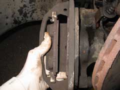 My pads were nearly at the end of there life as you can see. The piece on the right is the clip that holds them in. Once the caliper is removed from the mounting, it will still be connected to the brake hose. I just laid mine down out of the way, you may wish to tie your up for safety.