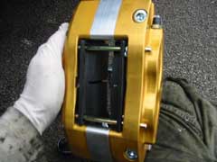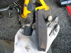 Once the split pin is in, you can gently knock the cover back on. Now it's time to fit those new calipers. Fit your chosen pads to the calipers, this is done via a large pin and clip (see above right).