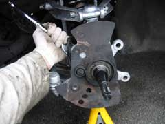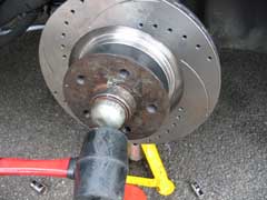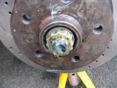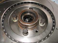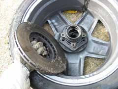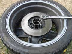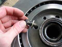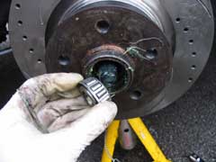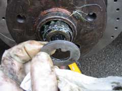 The 30mm nut is only done up hand tight and should come off really easily. The hub will now be free, but be careful of the thrust washer and outer bearing, as these are likely to drop out of the hub as it moves. Pull the hub off and turn it over. If you have ABS, you'll have a disc on the back of the hub, which covers the bolts to remove the disc