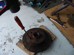 To remove this, just place a screwdriver through the hub and onto the disc. Lightly tap it with a mallet to remove it, allowing you to reach the bolts. The bolts are torqued tight, so the safest way to remove them is to rebolt the hub to a wheel, holding the hub securely. You can then undo the bolts without any chance of damaging the hub on a vice. You'll need to keep the bolts to use with the new discs.