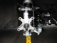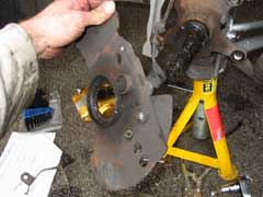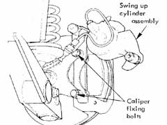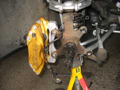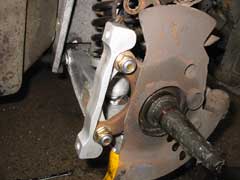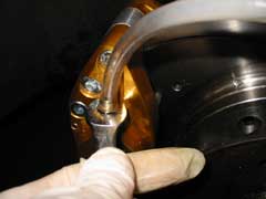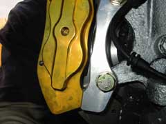 Above is the rear view of mounting the brackets. It's probably easier to fit the mountings before you replace the hub (see before). Use the allen head screws and spring washers supplied to fix the caliper to the mounting bracket, with the bleed nipples pointing upwards. Torque to 44lb ft