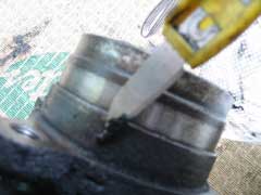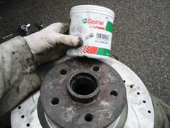 If you have ABS you'll need to replace the disc you took off earlier. This can be pushed on the then gently knocked into place. I used the rubber handle of a hammer. You now need to replace the hub (with new disc) back onto the car. You'll need to grease up the bearing before refitting. I used some Castrol grease from Halfords. Pack the rear of the hub with new grease after removing the old black grease. You can see the new and old discs together, the new disc does look a little larger than it should as it's sitting on the hub.