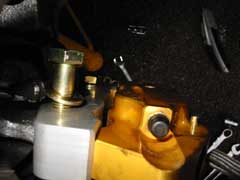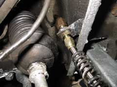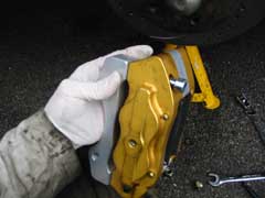 This is how the caliper attaches to a non-ABS equipped Esprit. The next picture shows it with the heat shield still attached. This is the best time to attach the mounting bracket (although I did it later). Clean up the fixing points, clearing any dirt or rust away, leaving a flat surface. With the flat surface of the bracket facing away from you, pass the supplied bolt (copperslipped) and washer through from behind. The fix with the nylon washer. Torquing to 60lb ft.