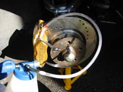 Fill up the brake master cylinder with new fluid. Then using a bleeding kit (I used a draper kit), bleed all four calipers. You will also need to bleed the two nipples on the master cylinder if you are running the Delco system. This system is a pressurised, and you will need to follow the workshop procedure for bleeding. Check the fluid doesn't run out as you go. The rear caliper nipples are 10mm, the new calipers are 11mm. The new calipers have two bleed nipples each, which both need bleeding.