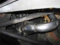 With the pipes all in place and rattling around, unscrew the downpipe connectors and do a dry run fitting it to the manifold pipes. In a perfect world they would all slide on perfectly but it might be the case that you will need to loosen some of the manifold pipes even more to allow the pipes to clear the chassis and fit in the downpipe. I removed the small silencer to give me more space to work with.With everything fitting pull the downpipe off and apply liberal amounts of exhaust sealing paste to the inside of the downpipe connectors. Work quite quickly to avoid the paste drying out before you have fitted it. Once you are happy that the downpipe is on properly, tighten the manifold nuts. After ensuring the downpipe has not moved tighten the fastenings with a 10mm socket/spanner.