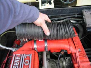 Using a flat-head screwdriver to loosen the jubilee clips from the pipes. There are four to do. The picture to the right shows where the air is forced into the tube passing into the engine bay and back out into the second pipe before entering the air box.