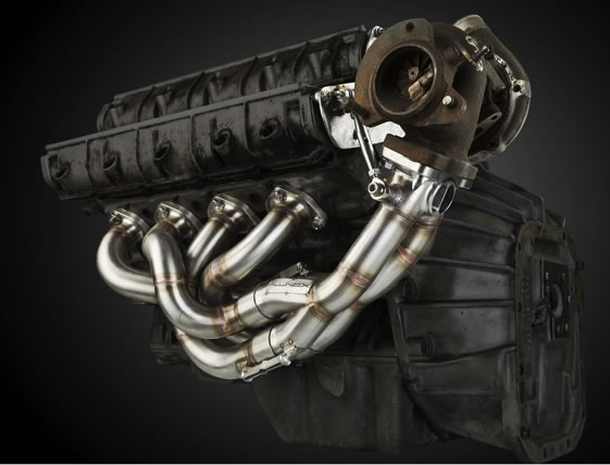 The downpipes are all equal length mandrel bent tubes which increase the pulse tuning effect greatly over the standard non equal length log cast configuration of the original unit. In addition to this flow is also maximized due to the smooth internal surfaces arranged to fit within the space available unlike the rough flaking internal bores of the original. The collector is now a CNC machined single piece for maximum durability and strength. It also offers an option for the Stevens Cars to run an external wastegate.The manifold has been proven to withstand all the temperatures and conditions produced by the Esprit due to the 321 Stainless steel properties. Even at normal driving speeds the exhaust gas temperatures are typically 750 to 850 °C and greater during track use. The manifold is lighter than the original cast unit weighing only 6 Kg. All these attributes produce a durable high quality product with proven gains in both power, torque and turbo lag reduction.