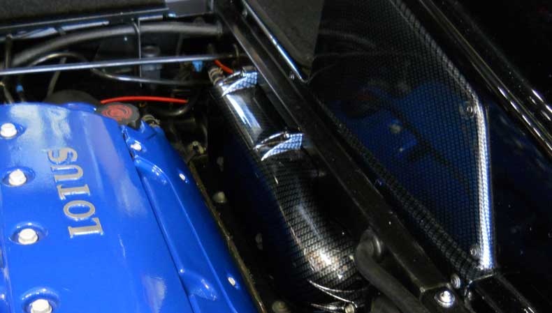 So I went to an alternative method. Carbon Fiber Hydro Graphic Finishing. It is a widely used process in the auto industry. It has a high quality finish, is durable, and offers a wide selection of finishes. My son in law owns a powder coating business (he refinished my plenum and cam covers in the Sport 350 blue) and recommended a shop that might be willing to take on small special projects. I contacted Mike and Sandy at VC Finishes and explained what I wanted. They were willing to listen and take this project on even after I told them it was for a Lotus.