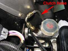 First thing to do is remove the clutch hose. Do this carefully as it will have plenty of clutch fluid in it if you didn't flush the system when fitting the slave. The Master is attach via two 13mm bolts, it is also held in via a metal plate that attaches to the brake servo. The plate needs loosening to release the master cylinder. A 15mm bolt holds the plate in position.