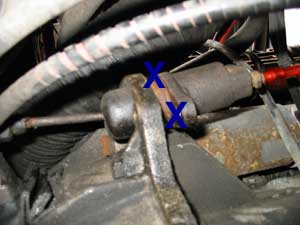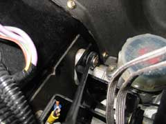 The Master cylinder pushrod will need to be disconnected from the clutch pedal to release the cylinder. So once in the Lotus position (head under the dash, legs up in the air), you see the rod coming through the bulkhead and attaching to the top of the clutch pedal. Please note that some pedal will have two holes, so make a note of which hole the rod is attached to for reconnection. The rod is attached with a clevis pin, which is held in place by a retaining pin. The pins are easy to remove, releasing the pushrod and in turn the Master cylinder.