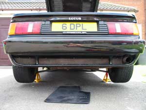 This is also covered under the 'Red Hose' Guide and I've used some of the pictures from that guide. First jack the rear of the Esprit up and secure with Axle stands. You'll be working on the Offside, but I raised the whole rear. Remove the Offside (drivers side for UK) wheel. The Slave Cylinder is located up behind the rear suspension. Remove the two 13mm bolts holding the slave to the side of the gearbox.