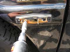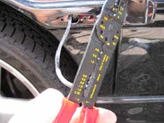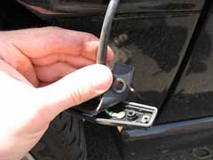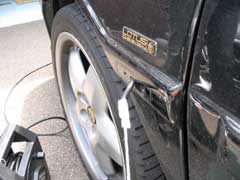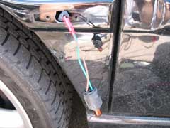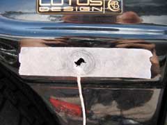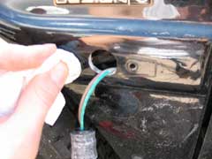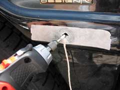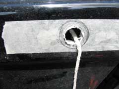 Now the original hole isn't big enough for the new indicator and holder. So you'll need to open it out a bit. Firstly tie some string around the wire and push it back in the whole. This will shop you from losing it in the wing. Then place a strip of masking tape over the hole. This will help protect the paintwork. Mark up the size of hole you'll need to cut.