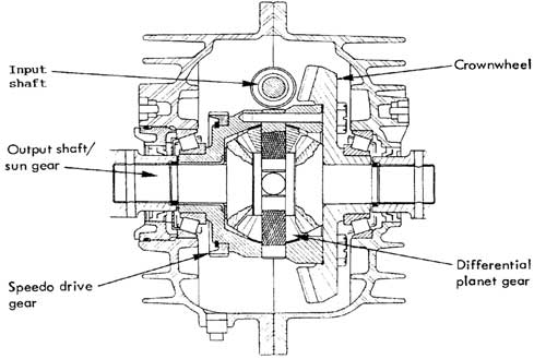The final drive assembly is incorporated into the front end of the transmission casing between the clutch housing and gearbox, and shares a common oil supply. A spiral bevel gear crownwheel and pinion is used, with a four pinion bevel gear differential.