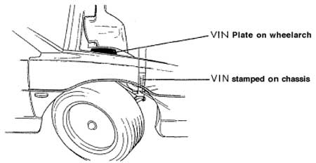 The Vehicle Identification Number (VIN) is stamped on a plate fixed to the right or left har.d front wheelarch inside the front luggage compartment. This number is repeated on the right hand side of the chassis front frame, visible from within the right hand front wheelarch.