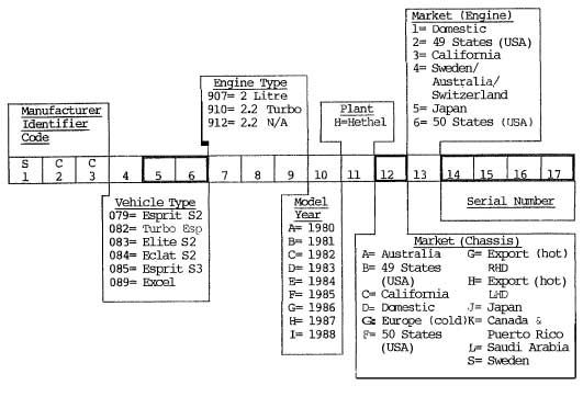 (Vehicle Indentification Number) Where is it and what does it mean?We had a few questions about VIN numbers in the past, so thought it's about time we sorted out a short guide for Esprit owners to clear up all the information about VIN numbers on the different Esprit engines. This information is taken from the service manuals of each model. Unfortunately the early manual weren't as informative as the later ones. So here we go.