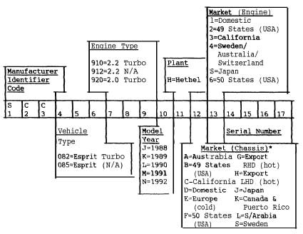 501 = Basic Elite 521 = Basic Eclat 701 = Basic Esprit 502 = Elite A/C 522 = Eclat A/C 702 = Esprit A/C 503 = Elite A/C & PAS 523 = Eclat A/C & PAS 701 Comm = Esprit Commnerative 504 = Elite Auto A/C& PAS 524 = Eclat Auto A/C & PAS 702 C m = Esprit C m . A/C 2. Seperate serial number sequences are used for the follwing groups of chassis mrket (character 12);