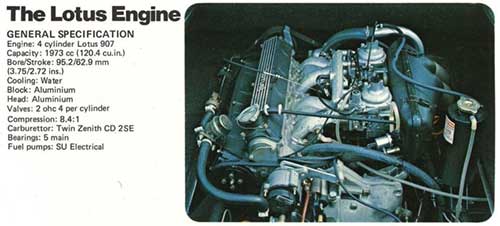 This new Lotus Esprit Mark 1 was an interesting mix of parts and technology. The 1,973 cc (120.4 cu. in.) DOHC inline four cylinder Lotus 907 engine breathed through twin Dellorto carburetors and produced 160 hp @ 6,580 rpm whilst delivering 140 lb/ft of torque at 4,800 rpm in European configuration, and 140 hp in US market configuration. This engine driving through the Citroën C35 5-speed manual transmission.