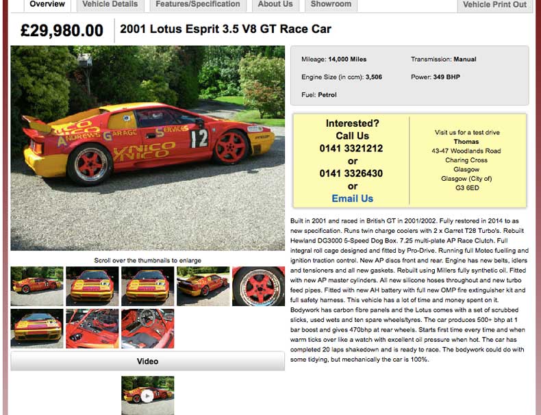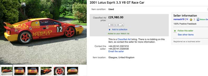 2001 LOTUS ESPRIT 3.5 V8 GT Race Car For Sale on Ebay.co.uk (July 2014)