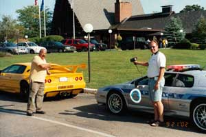 It's Colin in the car with another Lotus employee being the local youth on a bike. The setting is the turnoff the A11 dual carriageway to East Carleston and yes we had police in attendance to make sure we didn't get into the role of police patrol for real.... even so, the number of cars that hit the brakes as they saw us was most rewarding!