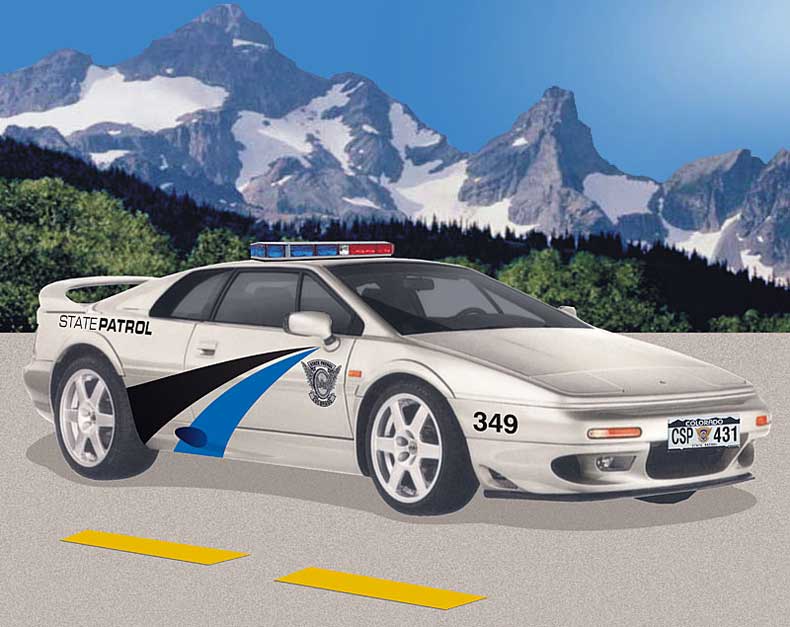 In passing I came across your website including the section under the Police Esprits. I was surprised to see my Colorado State Patrol car (above)....what I mean is that I am the the actual fellow who drew the car. The actual vehicle does not exist. About 4 years ago I created a series on Dream Police Vehicles which included Hummers, Lamborghinis, Mustangs, Corvettes and Camaros and of course one Lotus Esprit. A friend who is a Colorado Trooper Station Commander asked me to create a photo realistic version of the Lotus Esprit for the wall on his office as a conversation piece.
