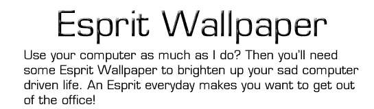 After a few requests for quality Esprit wallpaper for their computers. I've started to make a few and will add to them over time. The pictures below are 1280 x 960 pixels and should look great on any computers monitor. Click on the picture you want, that will take you to a page with the full size image on. The click right mouse button (click and hold on a mac) and 'Download Image to Disk'. Choose where you wish to save it and save! You now need to replace your current wallpaper with the new Esprit one. Will be under your control panel.