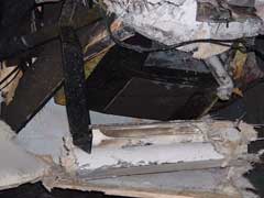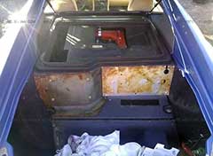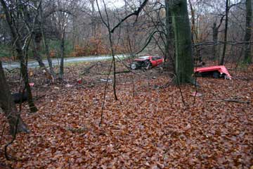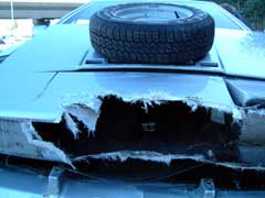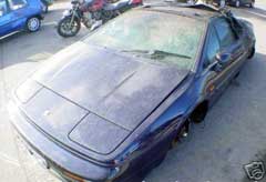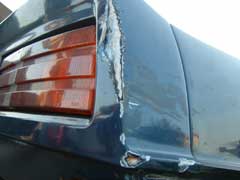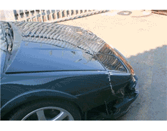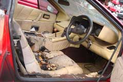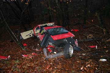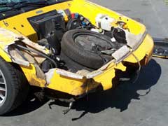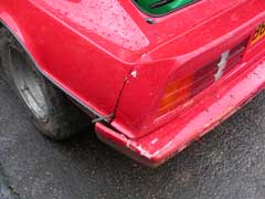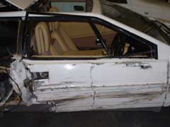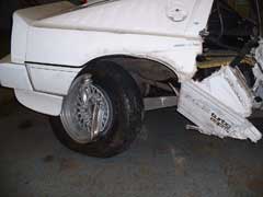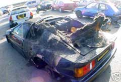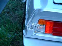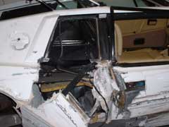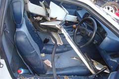 There was no bodywork aft of the b pillars except for the engine cover. The rear section and 1 rear alloy wheel was about 50 yds away. the other rear alloy was bent at 90 deg. Both cross struts between the a and b pillars were broken and all glass in the car was smashed. The drivers footwell had collapsed onto my right leg and the drivers door had been pushed in against my ribs. I was trapped for a few minutes until my fellow passenger managed to remove enough of the car for me to wiggly out.