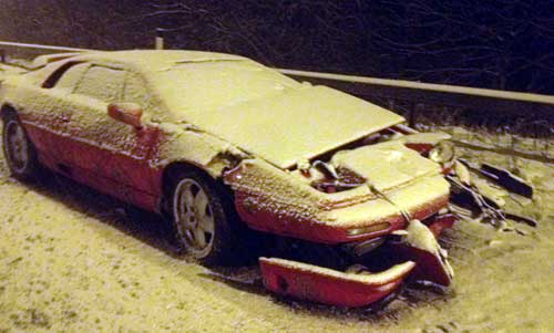 After it had passed, against all my better judgement, I slowly increased my speed to about 60mph, and began following the coach in the fast lane. Less than a few moments later I must have hit a patch of loose slush or something because I suddenly found the car veering right towards the central reservation; I eased off the gas and calmly pulled it back to the left, straightening- up the wheel, but the car didn't stop turning: within moments I was going into anti-clockwise spin at around 55mph. I hit the left hand side crash barrier three times on three different corners of the car before it came to a rest - facing the right way, but straddling the fast and slow lanes of the dual carriageway. I'd hit the side of my head hard against the driver's side window, but it hadn't broken, and I was shaken up but basically ok. I remember my head being very clear and collected during the spin, but as the car slowed, the fear of being hit hard from the side or behind took over and at the very next gap in the traffic, I leapt out and raced across the carriageway to the relative safety of the central reservation with lorries and cars whooshing by either side of the wreck as everyone's speed diminished as the tailback began to form. The car, seemingly in neutral, now proceeded to roll backwards down the hill until it eventually came to rest on the hard-shoulder some 50 metres back from where it had originally landed.