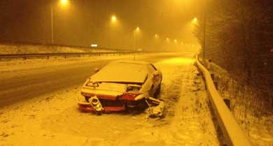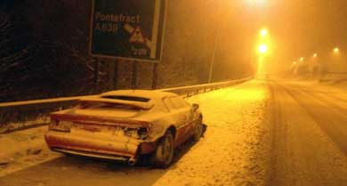 At the time of the accident the snow hadn't really begun to settle, and was much less than what is alluded to in these pictures. I had been doing about 50mph all the way, with many people going much faster. By now I was on a straight section of dual carriageway on the A1 heading north near Barnsdale Bar in South Yorkshire. Many other rear wheel drive cars had been overtaking me at higher speeds, and we were now approaching the start of a hill. A National Express coach that had already flashed me twice pulled out and began overtaking me - it apparently didn't want to lose its momentum, and thought I was going unreasonably slowly up the hill.