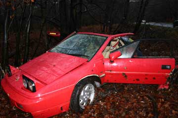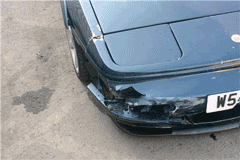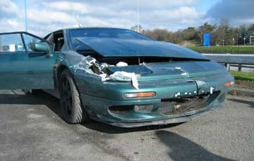 This happened on Good Friday 2004 while out for a drive. I came over the crest of a hill to see what I thought was a road that went straight on then the sudden realisation that it was in fact a sharp left hand corner with a straight entrance road to a college in front of it! So I got on the brakes and the back went light (due to being on the brow of a hill) and stepped out to the right and hit a car traveling in the opposite direction which then sent me into the grass bank at the side of the road!!
