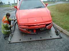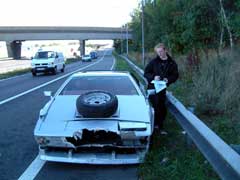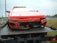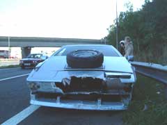 These pictures are from 5th October 2003. Yahoo! member Robin's (Evil Dr Fish) Esprit was badly damaged when too much turbo on a wet bend cause it to spin and hit the crash barriers. All the damage was bodywork with no damage to the chassis or suspension. Luckily Robin and his passenger were uninjured in this accident, which is the most important thing. I hope this will remind you that the Esprit IS a supercar and to be careful.