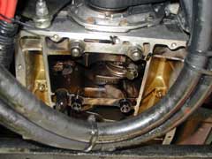 Well now back in Holland, Peter at Van Stens has started work on my car again, and he has found a leak from the Sump gasket around by the flywheel (see pics) so the Sump has come off and the whole lot is being cleaned before a new gasket is put on and everything reassembled again. Hopefully this time all the oil leaks will have gone, as I am missing my baby and need her for the www.maartenmemorial.com sponsored run on the 4th August. If you want to see the underside of an engine without the sump on...take a look..