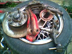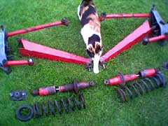 The 1/2" UNF mounting bolts for the rear suspension components were very corroded and required cutting to enable the rear suspension to be removed from the car. Once the rear suspension was removed it was disassembled and paint stripped.